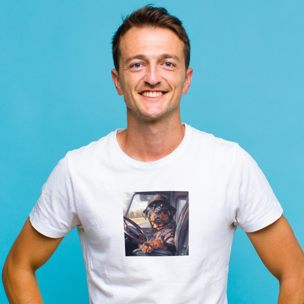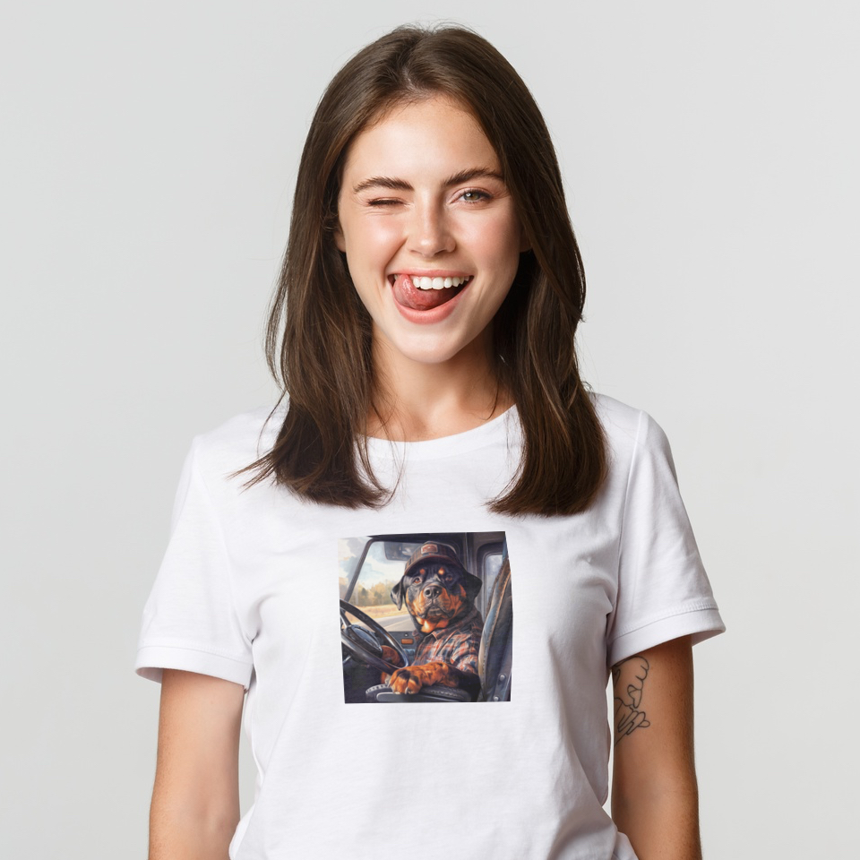 Buckle up - this Rottweiler is taking the wheel! With a no-nonsense stare and paws firmly on the wheel (metaphorically, of course), this pup is here to chauffeur you in style. Perfect for dog lovers who enjoy a smooth ride with a side of woof!