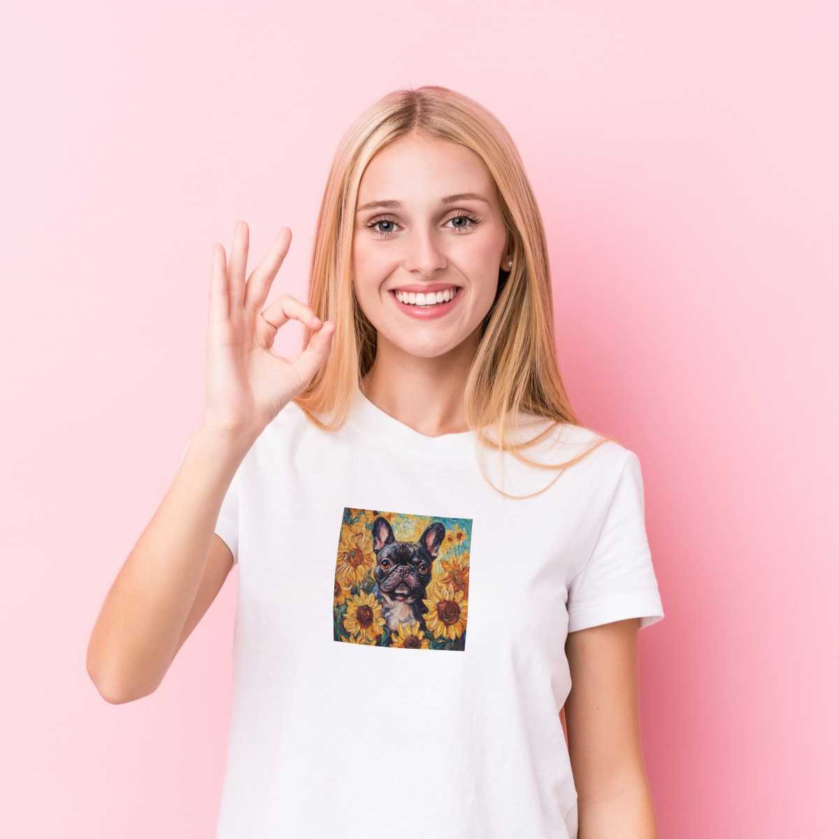 This Frenchie is blooming in Van Gogh style! Reimagined with the vibrant flair of Sunflowers, this pup is bringing color and charm to your wardrobe. Perfect for art lovers and dog enthusiasts alike, it's a lively twist on a classic masterpiece!