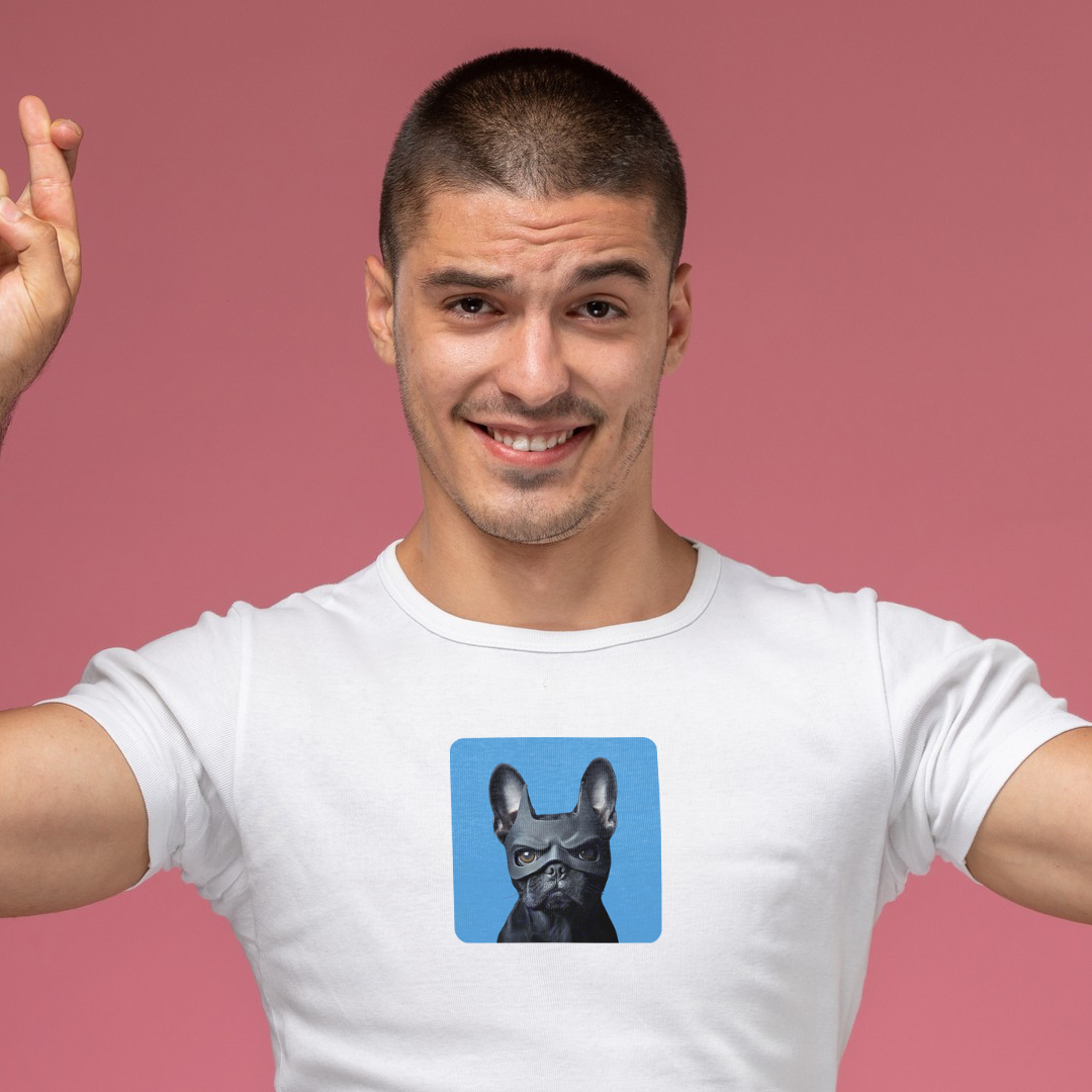 This Frenchie is ready to save the day—one snort at a time! With a Batman mask on, this little hero is here to add some quirky crime-fighting charm to your wardrobe. Perfect for dog lovers and superhero fans who appreciate a touch of paw-some power!