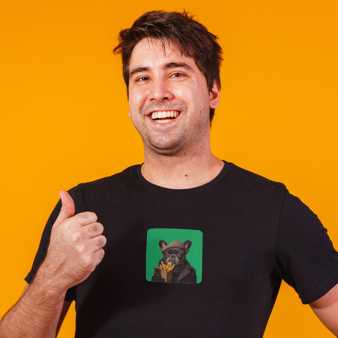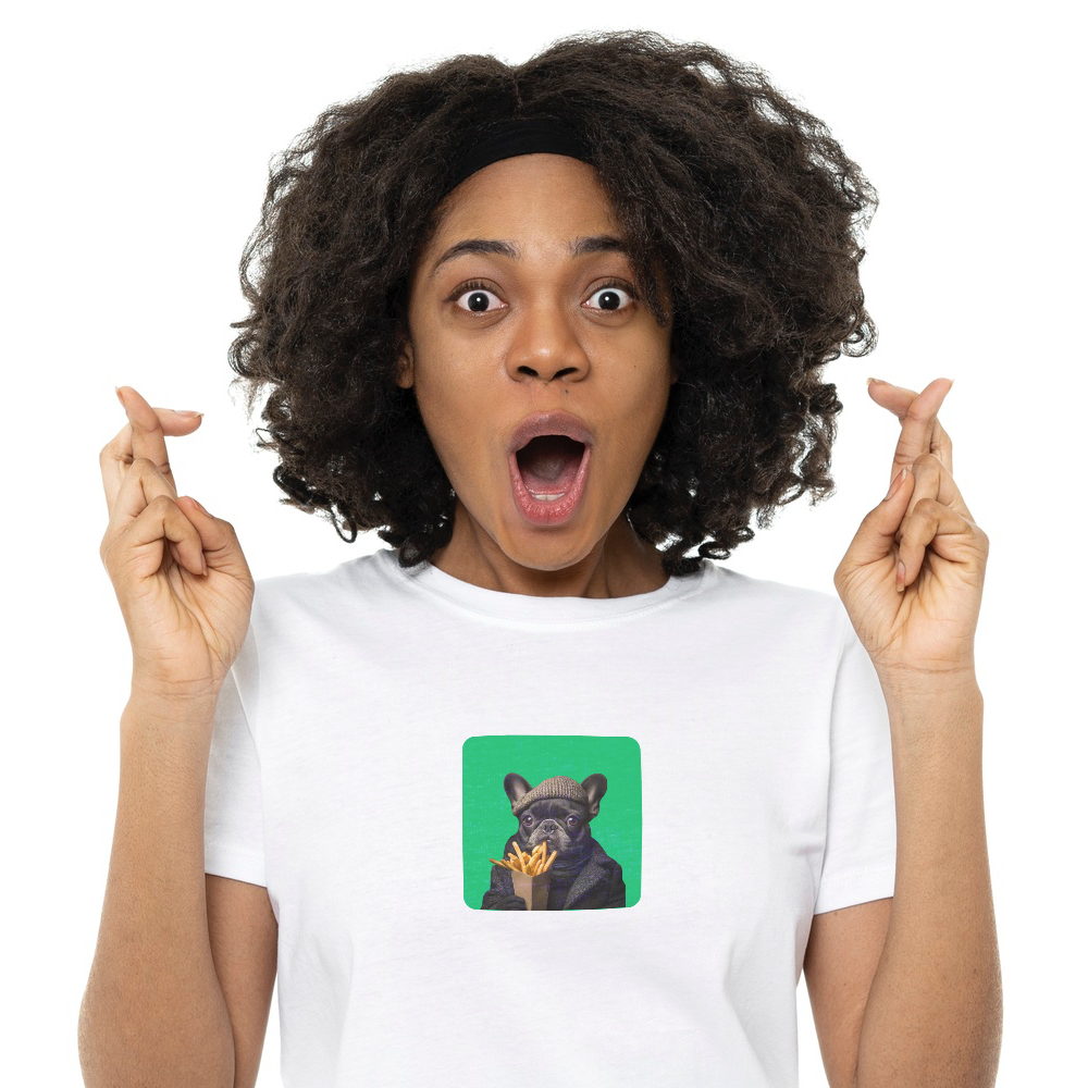 This French Bulldog is serving up style and snacks! Rocking a chic coat and holding French fries in paw, this pup knows how to look good and snack in style. Perfect for dog lovers and foodies, it’s the ultimate tee for those who love their pups with a side of sass!
