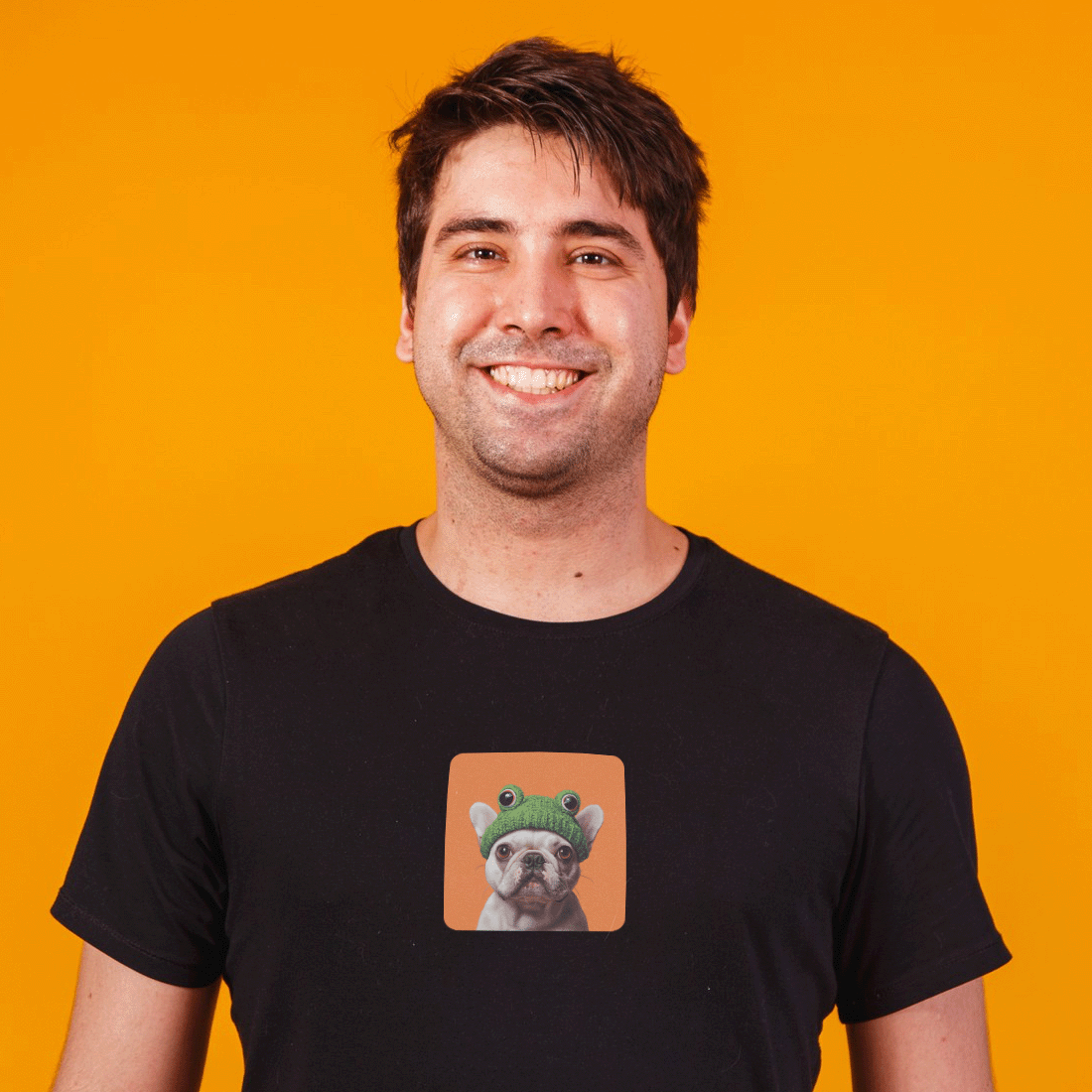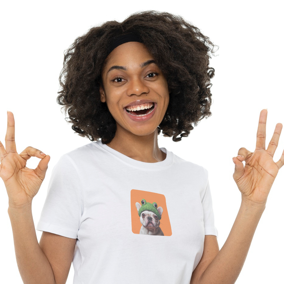 This French Bulldog is channeling its inner frog with a frog hat and some serious amphibian energy! Perfect for dog lovers who enjoy a fun, froggy vibe with their style!